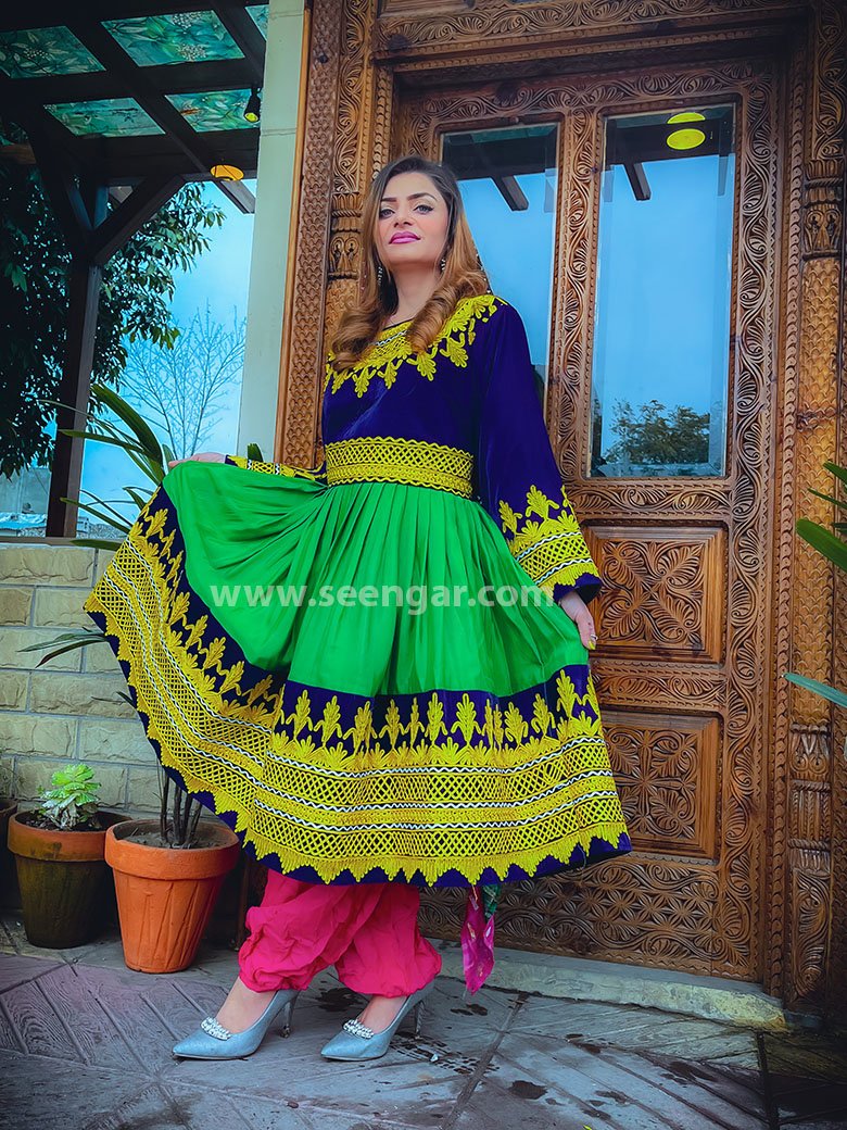 The Admiral Blue Zardozi Afghan Dress comes with light blue velvet on top followed by green colors and heavy embroidery on the bottom which makes it more appealing and sharp. What’s inside the package? Shirt (Kamees) Paint (Partoog) Matching Dupatta