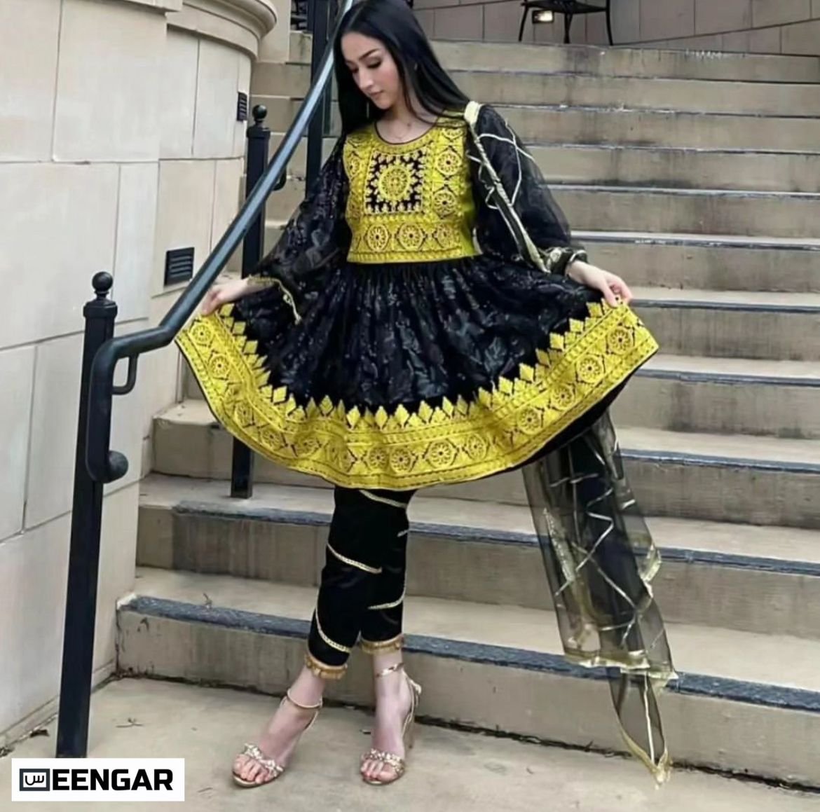 “Afghan Night’s Gilded Charm” is a mesmerizing short dress that beautifully combines the mystique of the night with opulent gold craftsmanship. Crafted from a black, shiny fabric, this dress gleams with a subtle sheen, reminiscent of a moonlit evening. The golden Zardozi embroidery, an intricate and traditional Afghan art form, adorns the dress, creating an exquisite tapestry of patterns and designs. The short and lightweight nature of the dress ensures comfort and ease of movement, making it perfect for various occasions. “Afghan Night’s Gilded Charm” embodies the essence of Afghan culture, where the dark night meets the shimmering allure of golden stars, making it a captivating choice for those seeking both elegance and traditional beauty in their attire. Chest design can be modified as per request. Box Included: Pant (Shalwar) Shirt (Kamees) Dupatta
