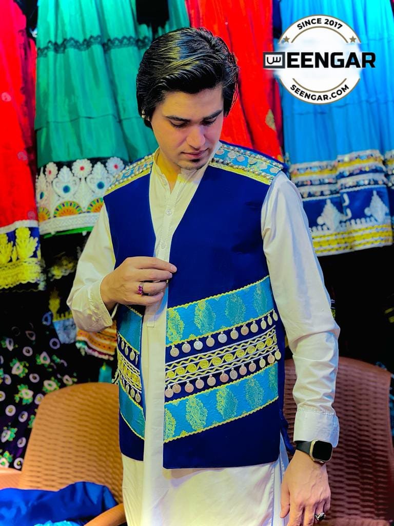 Introducing our “Azure Coin Charm Afghan Vest” — a mesmerizing blend of tradition and flair. This Afghan waistcoat, adorned with an enchanting shade of azure blue, stands out with its unique coin embellishments, creating a delightful charm that dances with every movement. The coin cascade on this vest adds a touch of bohemian allure, giving a nod to Afghan heritage and craftsmanship. The vibrant azure hue enhances the overall appeal, making it a versatile piece that complements both formal and casual ensembles. Whether worn over a traditional outfit or paired with contemporary attire, the “Azure Coin Charm Afghan Vest” makes a bold statement. Each coin tells a story of cultural richness and style, making this waistcoat a distinctive and eye-catching addition to your wardrobe. Step into a world of vibrant elegance and celebrate your unique style with the “Azure Coin Charm Afghan Vest.” Embrace the allure of Afghan craftsmanship and make a lasting impression at every event.