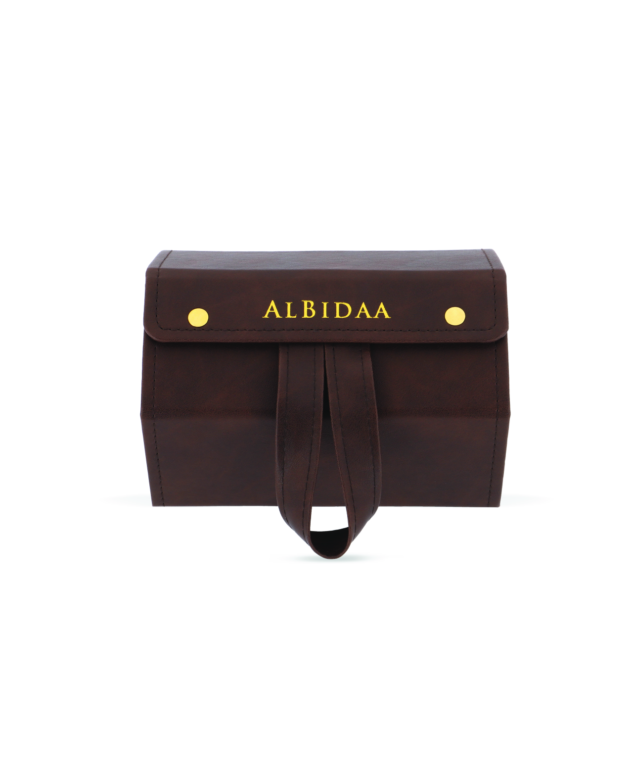 Eyewear Organizer – 6 Compartments Keep your sunglasses and reading glasses safe and impeccably stored with our premium Eyewear Organizer. Featuring six individual compartments, this lightweight roll-up case is crafted from rich brown leather and lined with soft suede for a luxurious touch and added protection. The design includes two secure press-stud closures, a leather loop for effortless hanging or carrying, and features an elegant finish with a gold-embossed Albidaa logo. Compact yet spacious, it’s ideal for stylish home display or convenient travel. Fits up to 6 sunglasses Brown microfiber leather & suede leather Rollable with button closure Gold embossed “Albidaa” logo Hanging loop for portability Dimensions 17 cm (H) x 12 cm (W)