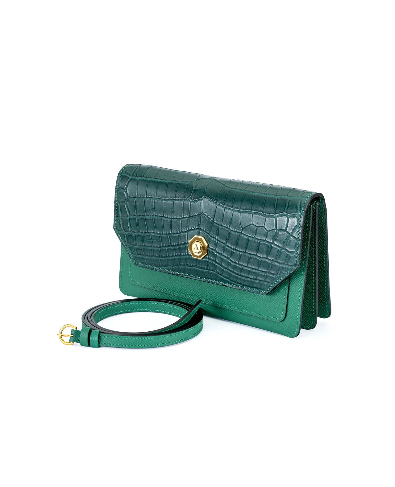Graceful, sleek, and refined—just like the animal that inspired its name, the Gazelle Ladies Clutch Bag is designed for the modern woman who moves with confidence and poise. Crafted from genuine Epsom leather & croc leather flap, it offers a luxurious texture with durability that stands the test of time. Function meets elegance with a structured curved flap, secured by our signature octagon golden hardware and a magnetic clasp for a seamless finish. Inside, the thoughtfully designed compartments include three main pockets—one of which is zippered at the front—alongside a small inner front pocket for added convenience. An open exterior pocket ensures easy access to essentials on the go. For versatility, the detachable strap allows you to switch effortlessly between a handheld clutch and a chic crossbody style. The Gazelle Ladies Clutch Bag embodies agility and sophistication, making it the perfect companion for any occasion. Description: Made of Epsom genuine leather with genuine croc leather flap Three main pockets (one zipped – front) Small inner front pocket Open exterior pocket Structured curved flap made of genuine crocodile leather Detachable strap Signature octagon golden hardware, magnetic clasp Made in Italy Dimensions: 22.5cm L x 3.25cm W x 13.5cm H