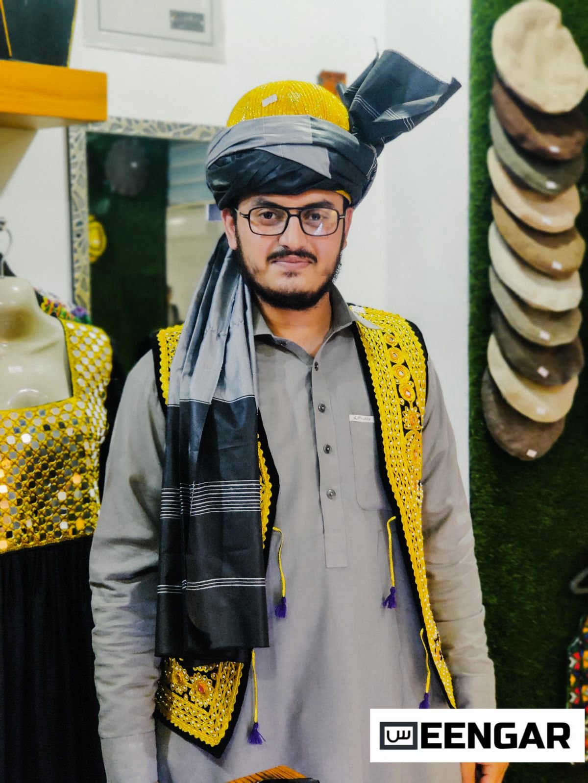 Introducing our Afghan Traditional Ensemble: a masterpiece of Afghan craftsmanship. This ensemble boasts intricate yellow Zardozi embroidery on elegant black velvet, complete with a matching turban and hat. Elevate your style with this timeless blend of art and tradition. In the box – Turban – Kula (Golden Hat) – Waistcoat Colors can be customized, please whatsapp us.